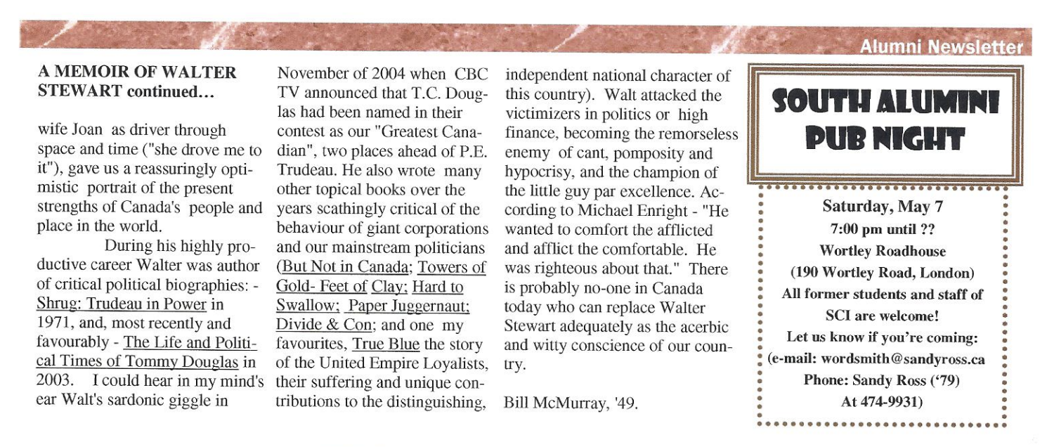 Walter Stewart died of cancer at his home in Sturgeon Point on September 15, 2004. He never learned to drive.