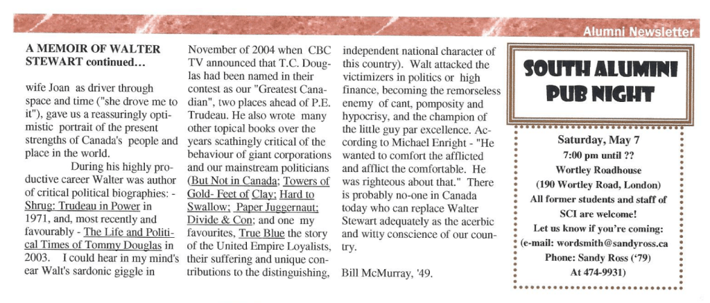 Stewart did not enjoy his time at the Telegram. “What I learned about journalism there, was that it was a suspect craft, dominated by hypocrisy, exaggeration, and fakery. At the Tely, we toadied to advertisers, eschewed investigative reporting, slanted our stories gleefully to fit the party line (Conservative) and to appeal to the one man who counted – the publisher, John F. Bassett.”