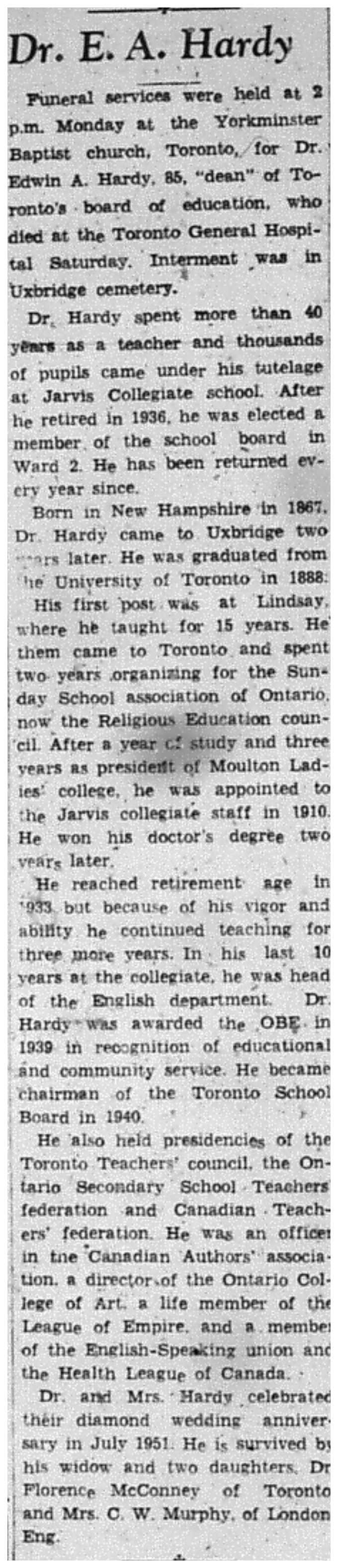 Dr. Hardy, in addition to his keen interest and active participation in educational and religious affairs, has found time to become actively engaged in other worthwhile pursuits. He is an author and literary critic. He has written several articles for magazines and periodicals in Canada, Great Britain and the United States. He is editor of Selections from Wordsworth and Tennyson. For ten years he was educational editor of the Toronto Globe. He is a member of the Incorporated Society of Authors, Playwrights and Composers of Great Britain. He is a member of the Arts and Letters Club of Toronto, vice-president of the Ontario Branch of the English-Speaking Union, vice-president of the Canadian Branch of the League of the Empire, vice-president of the Community Welfare Council of Ontario, member of the Magna Carta Association, member of the I. O. O. F., and vice-president of the Hardy Family Association.