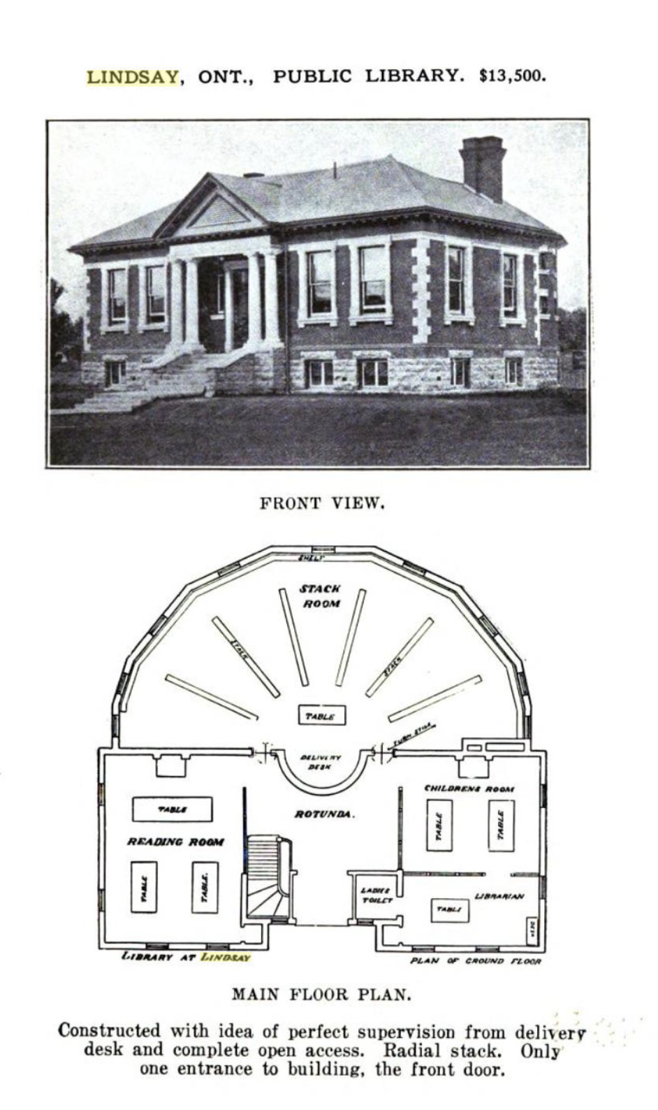 Although Hardy believed this to be ideal layout for a public library, James Bertram, who was personal secretary to Andrew Carnegie, did not. Bertram deemed the round rooms to be a waste of space. Lindsay’s half-circle design was one of the last with a rounded room and is one of the few such buildings still standing.