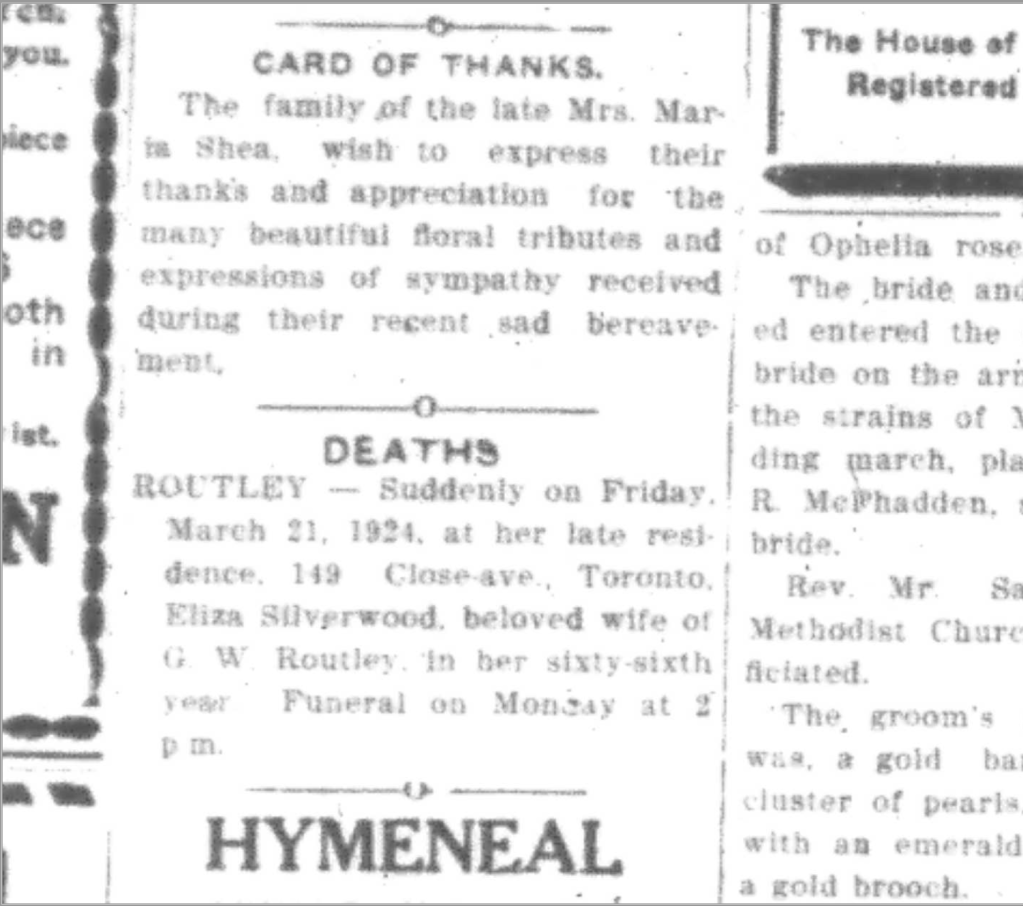 On March 21, 1924, Eliza Silverwood Routley passed away at her home at 149 Close Avenue, Toronto. (The house is gone, replaced by a Catholic school.)