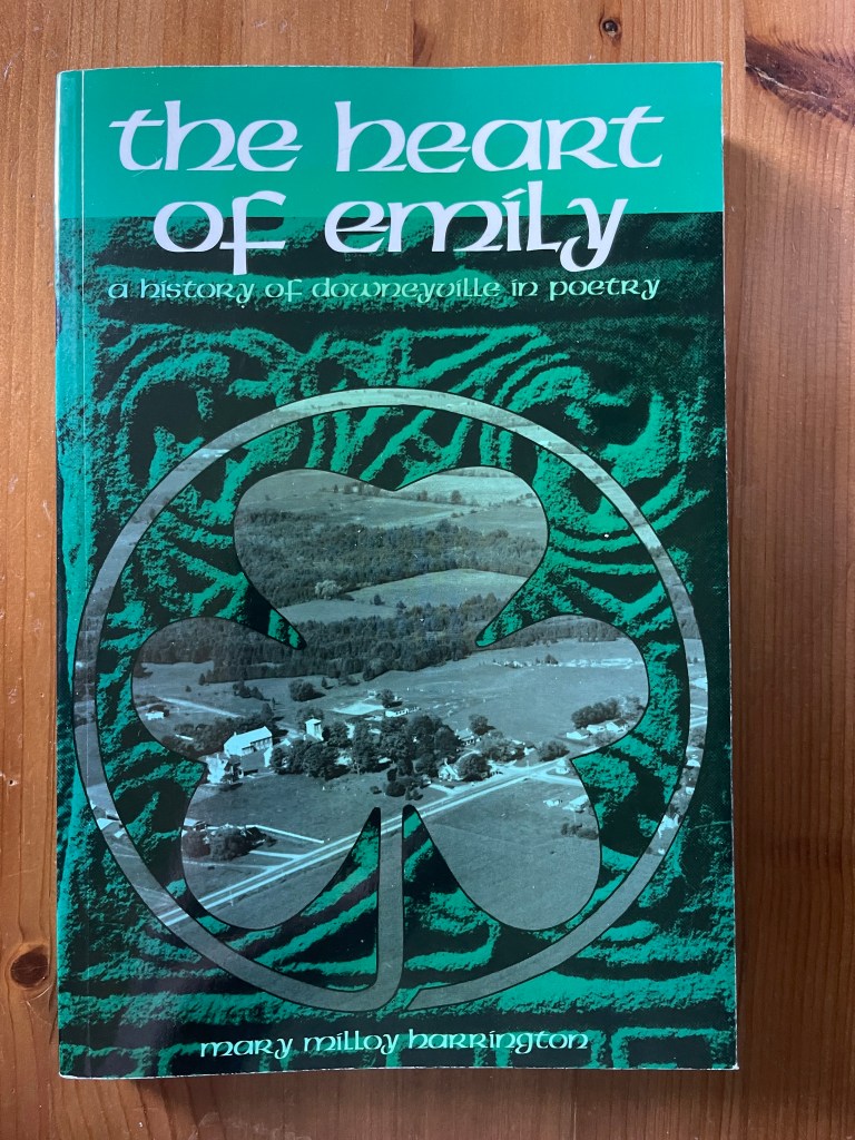 Mary Milloy Harrington says, “The Heart of Emily is a history of that part of Emily Township which makes up the Downeyville district, a history of St. Luke’s parish, and a story of the first pioneers who came from Ireland and settled in this new land.” Among her sources, she thanks, “Honorable Leslie M. Frost, Prime Minister of Ontario, for his assistance in giving the names of the original Grantees in the Downeyville district, and also Dr. Watson Kirkconnell, President of Acadia University, Wolfville, Nova Scotia, for his kindness in allowing me to use all information concerning Downeyville pioneers contained in his book Victoria County Centennial History.” She also thanks her neighbours for allowing use of their books, Crown deeds, and photos.